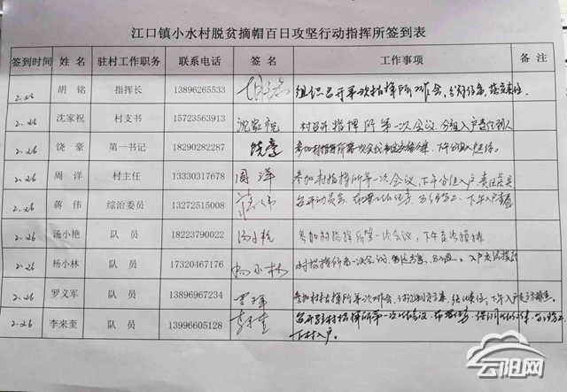 2月26日早上8點,在江口鎮(zhèn)小水村便民服務(wù)中心脫貧摘帽攻堅行動作戰(zhàn)指揮室,縣教委扶貧工作隊員在指揮長胡銘的指揮下,明確了具體工作內(nèi)容、責(zé)任、工作時間、工作紀律等。