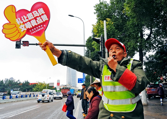 江北區(qū)寸灘街道蘭溪社區(qū)志愿者李仲賢在進(jìn)行交通文明勸導(dǎo)。