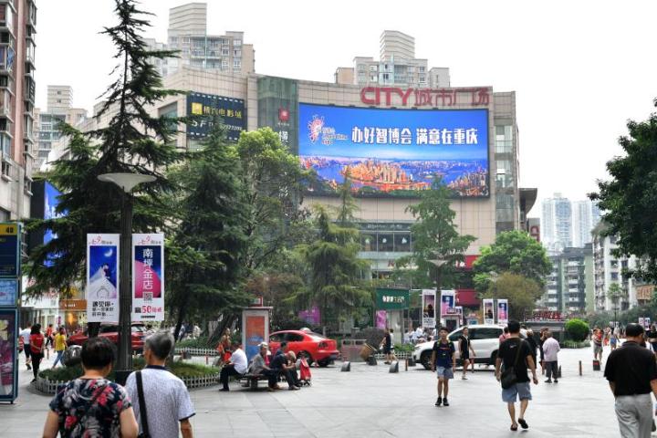 “智能化,為經(jīng)濟(jì)賦能,為生活添彩”“行千里,致廣大”“爭做文明人,共建新城市”……在江北區(qū)觀音橋步行街,幾個LED屏高頻率播放著智博會公益廣告,向來往市民和游客介紹著這次盛事。