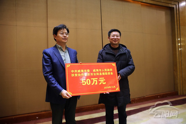 會議現(xiàn)場,威海市委市政府為云陽縣捐贈幫扶資金50萬元。