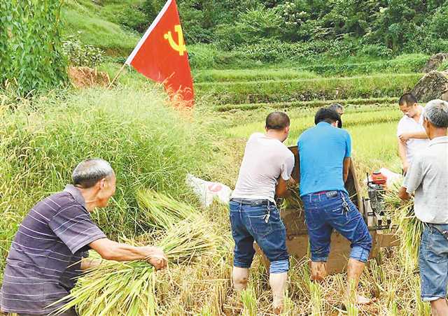 綦江區(qū)中峰鎮(zhèn)中峰村,黨員在幫村民收割稻谷。(綦江區(qū)委組織部供圖)