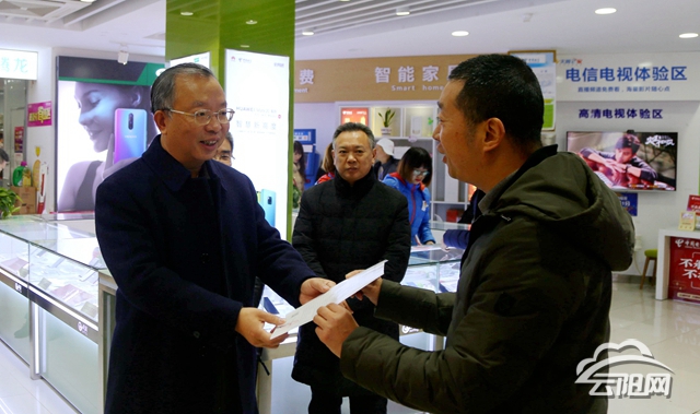 縣委書記張學鋒為中國電信云陽分公司負責人發放我縣第一份《第四次全國經濟普查單位普查告知書》。