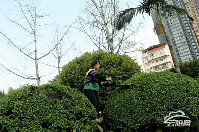 云陽網訊(記者 李充)3月27日,在縣城樓子包公園,園林工人正忙著對樹木修枝剪葉。