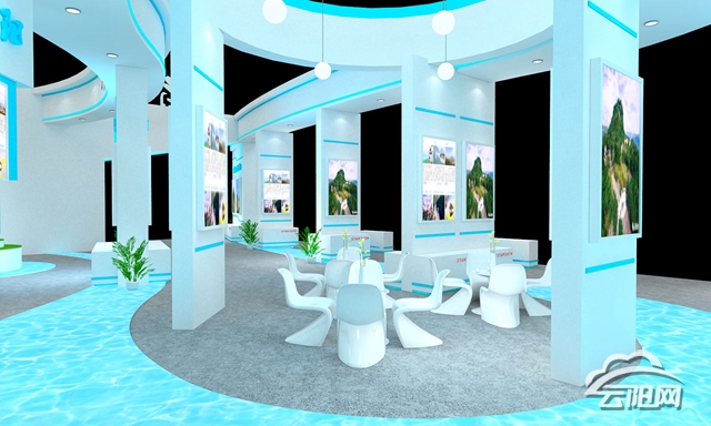 據(jù)了解,云陽(yáng)展館總面積390平方米,展館分為商貿(mào)及農(nóng)業(yè)產(chǎn)品展示區(qū)、工業(yè)板塊展示區(qū)、智能產(chǎn)品展示區(qū)、旅游展示區(qū)、洽談區(qū)、接待區(qū)等。展館主體造型運(yùn)用了云陽(yáng)著名景點(diǎn)龍缸云端廊橋?yàn)樵O(shè)計(jì)元素,以大氣科技感的藍(lán)白色為主色調(diào),多處采用梯形的設(shè)計(jì),引出云陽(yáng)的梯城之名,地面長(zhǎng)江流水的設(shè)計(jì)與頂上景點(diǎn)龍缸云端廊橋相呼應(yīng),使整體展臺(tái)與主題“萬(wàn)里長(zhǎng)江.天生云陽(yáng)”相結(jié)合,點(diǎn)名主題寓意。農(nóng)產(chǎn)品區(qū)運(yùn)用了嫩芽發(fā)芽,向陽(yáng)生長(zhǎng)的設(shè)計(jì)理念,突顯出農(nóng)產(chǎn)品的茁壯成長(zhǎng),寓意云陽(yáng)的發(fā)展越來(lái)越好。
