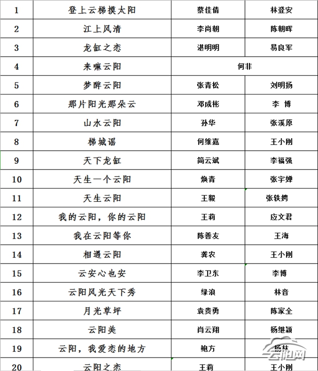 云陽網訊(通訊員 陳迪春)7月12日,經專家復評組復評,“萬里長江·天生云陽”云陽縣旅游歌曲征集活動20首入圍歌曲名單正式出爐。