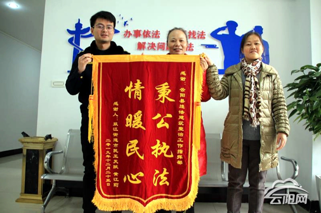 云陽網訊(記者 王彬彬)12月25日,家住雙江街道的黃女士把一面寫著“秉公執法 ,情暖民心”的錦旗送到了縣違法建筑整治工作指揮部辦公室,真誠地表達對縣城市管理綜合行政執法支隊拆違隊員的感謝之情。