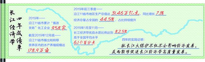 2019年前三季度,沿江11省市地區生產總值達31.46萬億元,同比增長7.1%,高于全國平均增速0.9個百分點,經濟總量占全國的44.5%,占比持續提升。“這充分說明,抓長江大保護不僅不會影響經濟發展,反而能夠促進長江經濟帶高質量發展。”推動長江經濟帶發展領導小組辦公室有關負責人說。
