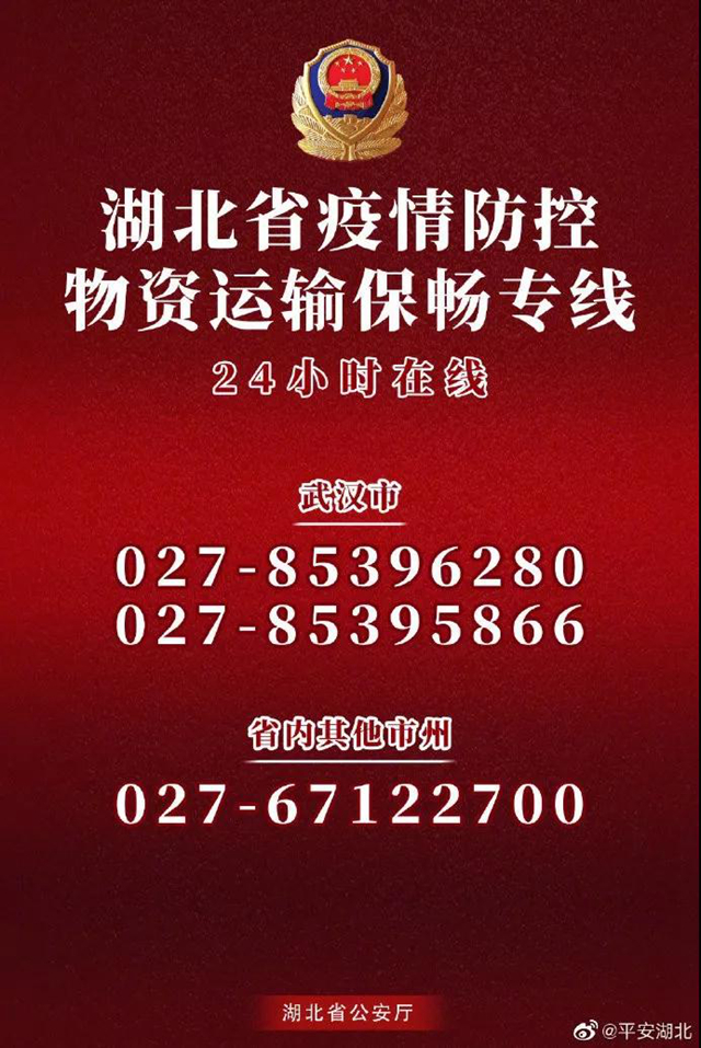 湖北省開通24小時(shí)疫情防控物資運(yùn)輸保暢專線,全省公安機(jī)關(guān)全力護(hù)航。武漢市:027-85396280、027-85395866;省內(nèi)其他市州:027-67122700。