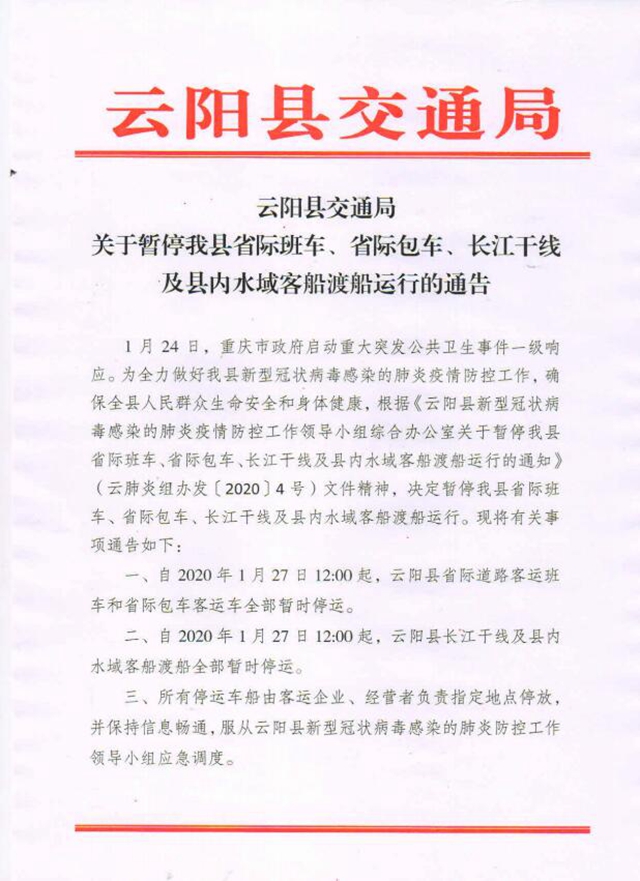 一、自2020年1月27日12:00起,云陽縣省際道路客運(yùn)班車和省際包車客運(yùn)車全部暫時(shí)停運(yùn)。