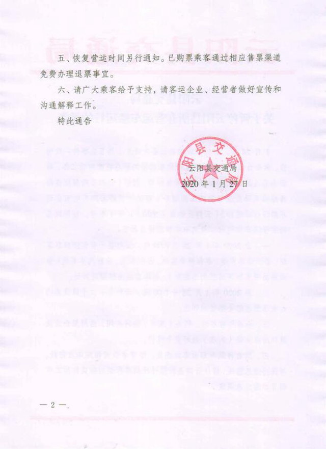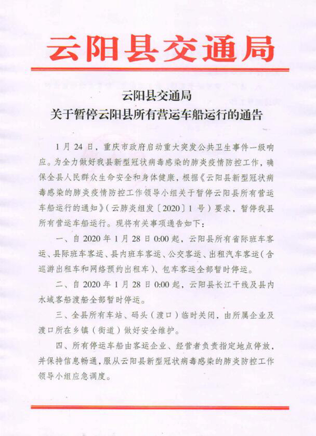 一、自2020年1月28日0:00起,云陽縣所有省際班車客運、縣際班車客運、縣內班車客運、公交客運、出租汽車客運(含巡游出租車和網絡預約出租車)、包車客運全部暫時停運。
