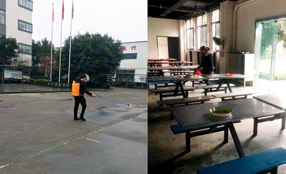 在復工的潼南涼風埡工業園區重慶遠望谷科技有限公司里,華龍網-新重慶客戶端記者看到,工作人員正頭戴隔離帽、身穿防護服,對企業生產現場、班組休息室、辦公樓公共區域等地進行消毒。