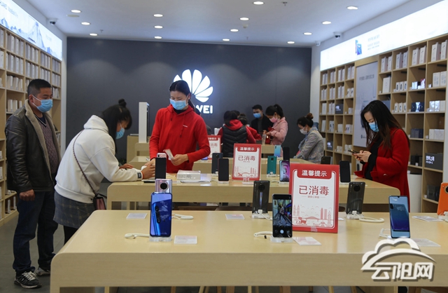 記者來到云江大道華為專賣店門口,看到不少戴著口罩的消費者正在選購手機?!霸缇拖霌Q手機了,前段時間天天在家里上網看款式、選型號,就想快點到實體店看看真機。一個多月沒出門了,今天一出門就來專賣店看手機,合適的話就準備買了?!笔忻窭钐m紅邊拿著店里的樣板機研究,邊跟記者說。