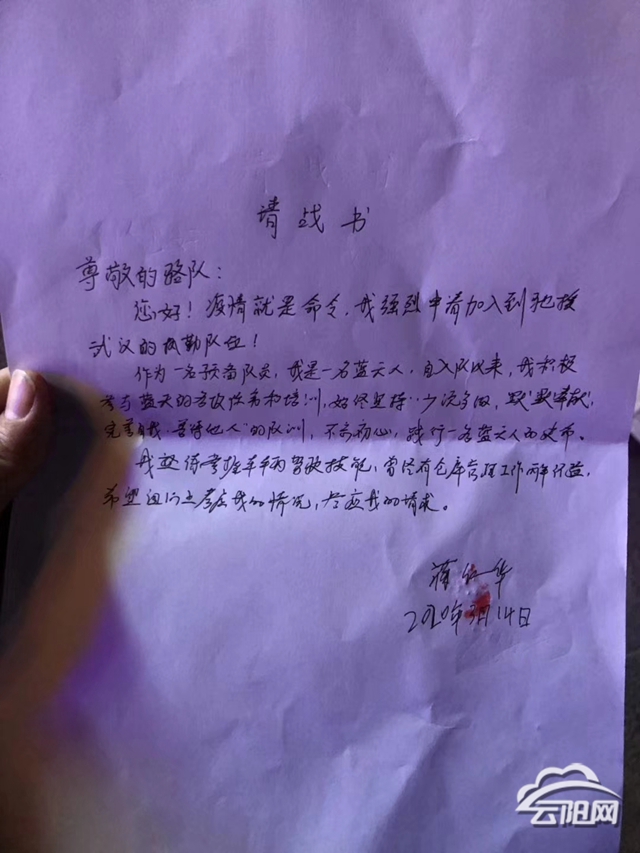 在賀皓亮的請戰(zhàn)書中寫道:“我是一名黨員,受組織培養(yǎng)多年,不忘黨恩,在人民群眾需要幫助時,義不容辭理應(yīng)奮勇向前。”賀皓亮是一名退伍軍人,也是孩子的父親、父母的寶貝兒子。“我的每一個身份都告訴我,我必須向前。我希望能給兒子樹立一個好榜樣。”賀皓亮眼神里充滿堅定。