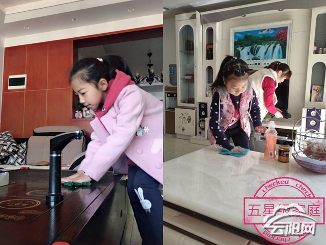 活動中,同學們拖拖地、擦門窗、抹桌椅、清理雜物、清洗盆盆罐罐,小鬼們個個是能手、人人當行家,全情投入忙得熱火朝天。隨后,孩子們拿起手機拍下最美瞬間,在釘釘班級群灑照片、秀勞動,交作業。“通過親子活動讓家里變得更整潔更靚麗,更讓‘神獸們’養成了愛勞動、講衛生的好習慣。”家長龔雪琴笑道。