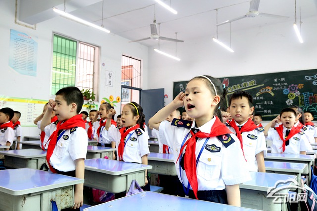 在一年級各班的教室里,268名孩子在輔導老師的帶領下,學習系帶紅領巾,握緊右拳,莊嚴宣誓,光榮地加入中國少年先鋒隊。