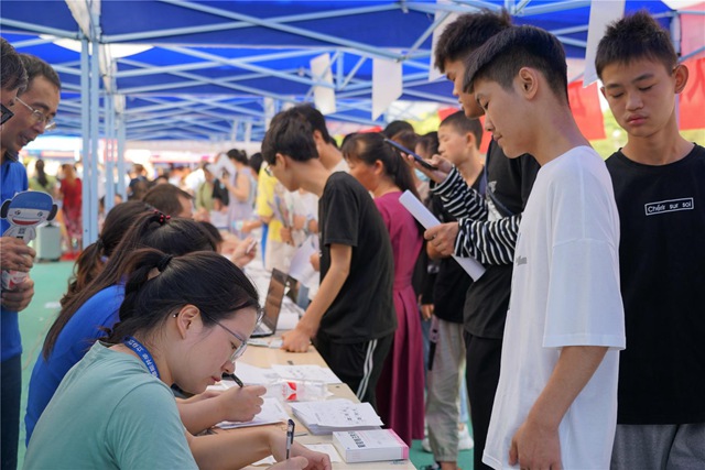 早上8點(diǎn)30左右,在縣職教中心校園內(nèi)處處可以拎著行李、帶著父母前來報(bào)名的心聲。在學(xué)校的工業(yè)機(jī)器人和大數(shù)據(jù)專業(yè)咨詢報(bào)名處,家長學(xué)生更是將報(bào)名臺(tái)圍得水泄不通。