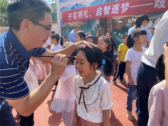 在大會熱烈的氣氛中,一年級新生們迎來了莊嚴的拜師禮儀式。全體學生面對自己的老師行三鞠躬禮,表達了他們對老師們的無上的敬意和無限的熱愛。接著老師們?yōu)楹⒆觽儭爸焐皢⒅?”,在孩子們額頭正中點上朱砂,即為“聰明記”,又稱“開天眼”,從此成為眼明、心明、好讀書、讀好書的聰明學童。