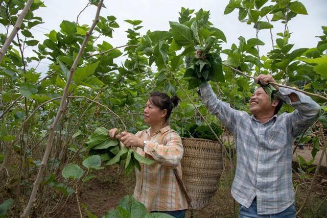 付定祥夫妻倆一起在田壟上采摘桑葉