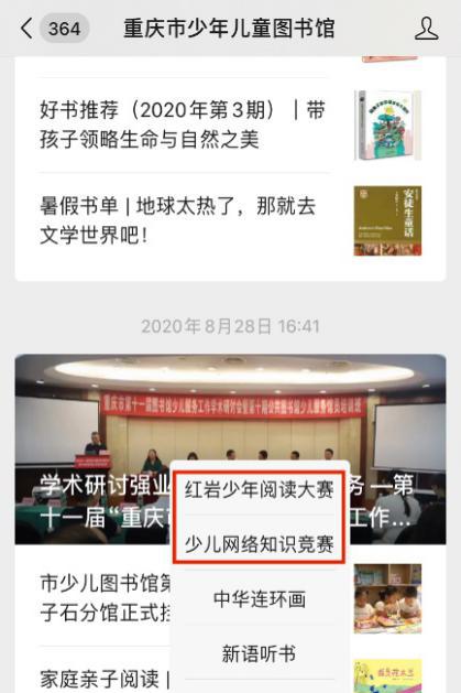 關注“重慶市少年兒童圖書館”微信公眾號,點擊“活動”——“少兒網絡知識競賽”。