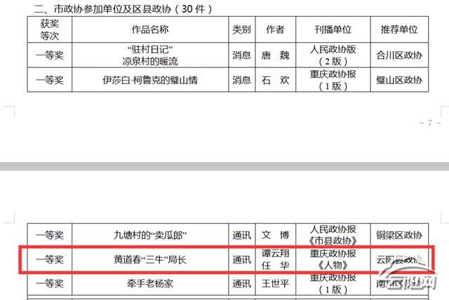 云陽網訊(記者 陳愛玲)日前,從政協重慶市委員會辦公廳傳來喜訊,云陽縣政協譚云翔、云陽縣環保局任華撰寫的《黃道春:“三牛”局長》,榮獲2019年度“重慶市政協好新聞”一等獎。