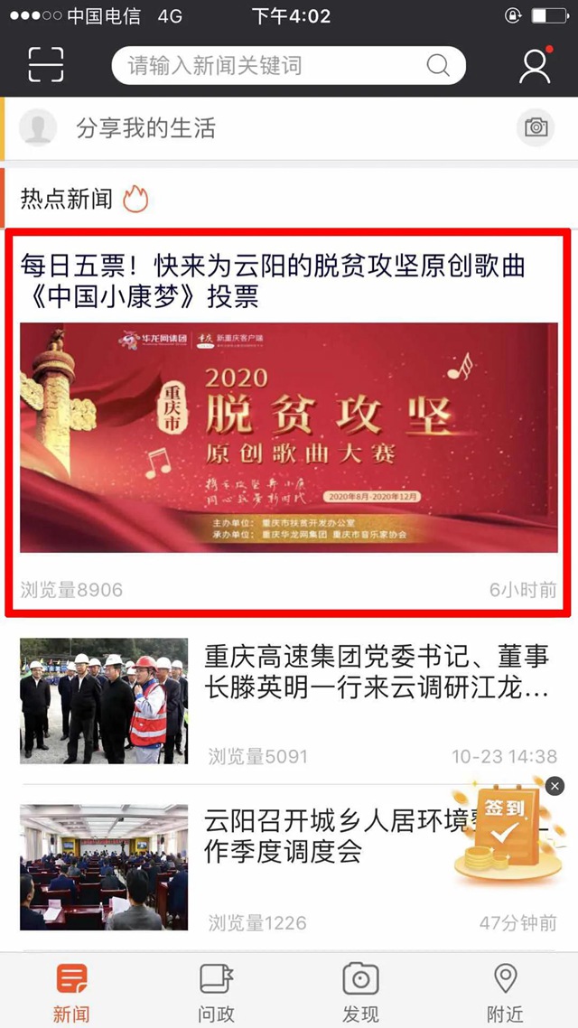 方法一:進入“智慧云陽”APP,點擊首頁“2020重慶市脫貧攻堅原創(chuàng)歌曲大賽投票活動”新聞,進入投票通道。