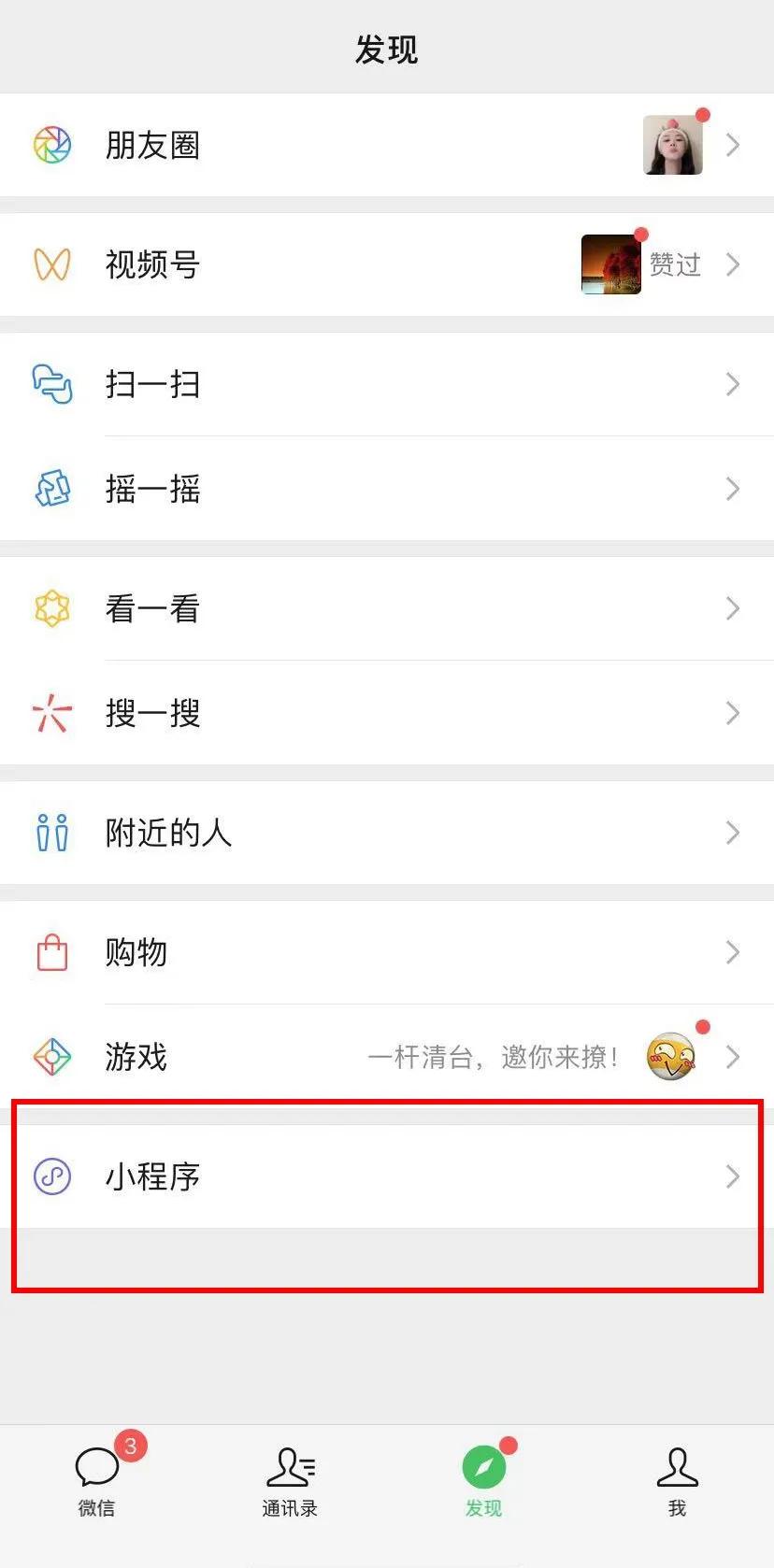 第一步:打開微信。點(diǎn)擊底部“發(fā)現(xiàn)”,進(jìn)入“小程序”