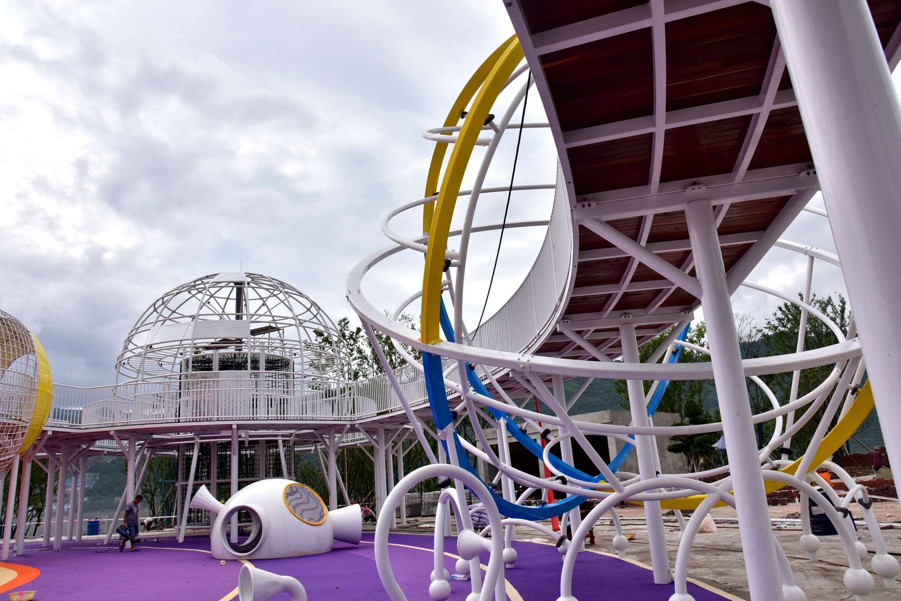 沿著環湖綠道,經過月光草坪,彩云陽光兒童游樂園正在抓緊施工中。據了解,彩云陽光兒童游樂園是環湖綠道的節點之一,占地10余萬平方米。公園整體布局以海、陸、空為主題,其中“海洋”主題中一艘按照2:1比例還原的南海戰艦(云陽艦)停靠在江邊,威風凜凜,令人印象深刻。這艘戰艦包含兒童游樂設施以及科普平臺,集游玩、學習科普為一體,適應不同學齡兒童的游樂需求。而“星空”主題里,則巧妙分布著地球、月亮等不同星球形狀的攀登、滑行游樂設備,不僅好玩更好看。此外,在“陸地”主題中,還有重慶軌道交通集團捐贈的輕軌車頭及三節車廂精彩亮相。