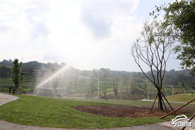在外環大道其中的一處觀景平臺施工現場,二十余名工人在完成草坪基礎鋪設后,正頂著烈日繼續壓緊壓實草坪,確保草坪根部與地面土壤充分接觸。隨后工人還通過灑水車對草坪進行了全面澆灌,進一步提高草坪存活率。