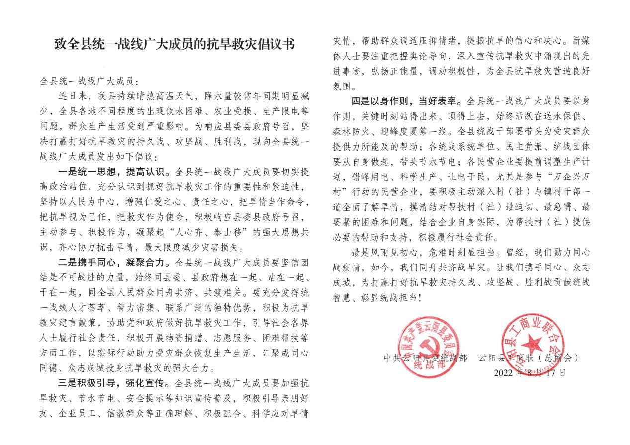 云陽網訊(通訊員 扶曉)近日,為有效應對今年極端天氣造成的農村部分地區生產生活用水困難、農業受損、生產限電等問題,按照全市統戰部長會議暨全市統一戰線“大走訪大談心活動”總結部署會“要服從服務全市中心大局”要求,以及縣委縣政府抗旱救災工作調度會議精神,云陽縣委統戰部、縣工商(總商會)向全縣統一戰線廣大成員發出了《致全縣統一戰線廣大成員的抗旱救災倡議書》,倡議廣大統戰成員,切實提高思想認識,圍繞當前旱情,主動作為,積極參與到全縣抗旱救災工作中來,積極為抗旱救災建言獻策,協助黨和政府做好抗旱救災工作,以實際行動助力受災群眾恢復生產生活,幫助解決受災群眾最需要解決的困難和問題,共同打贏打好抗旱救災持久戰、攻堅戰、勝利戰。倡議發出后,云陽縣廣大統戰成員積極響應,勇擔社會責任,齊心協力抗擊旱情災情,竭盡全力減少災害損失。