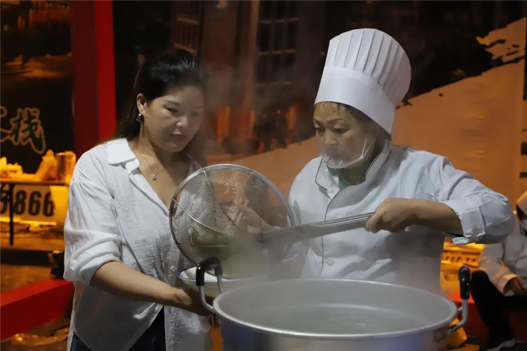 在面食區,師傅們起鍋燒油,精準掌握最佳油溫,熱油倒入辣椒面中,伴隨滋滋聲響,香酥之氣立馬襲來,紅亮亮的油辣子刺激著味蕾。