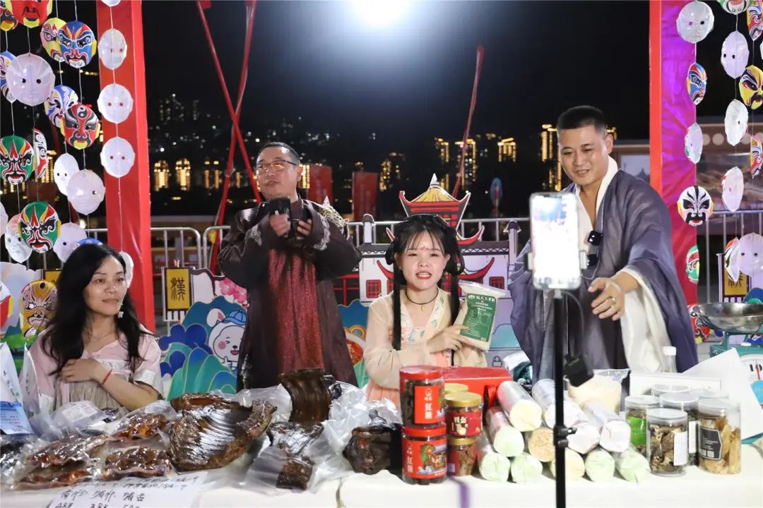 活動現場還設置多處打卡點和5個電商直播間,邀請主播直播帶貨云陽小面、紅糖、臘肉、王大漢桃片糕等特色產品,當晚5個電商直播間,總共銷售800余單。