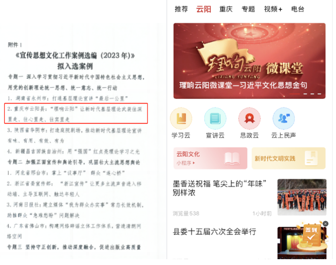 建立學(xué)習(xí)、宣講、宣傳和轉(zhuǎn)化“四位一體”的“理響云陽” 理論傳播工作體系,組建“磐下雲(yún)虹”宣講隊、多部門聯(lián)動共建共享“理響云陽”App、公眾號,在群眾家門口“搭臺唱戲”,在大眾移動端“差異供給”,靈活開展“理響+”宣講,推動黨的創(chuàng)新理論成為廣大黨員干部群眾政治上的主心骨、思想上的定盤星、行動上的指南針。“磐下雲(yún)虹”宣講隊開展重大主題宣講活動7100余場次,2022年、2023年均榮獲全市基層理論宣講先進(jìn)集體稱號。“理響云陽”經(jīng)驗做法入圍中宣部《宣傳思想文化工作案例選編(2023)》。