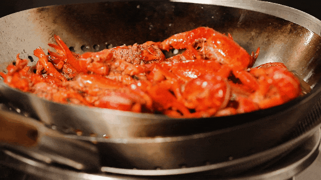 正式開炒,將蔥、姜、辣椒、花椒等香料爆香,倒入過油后的小龍蝦混合翻炒,再加入高度白酒去腥增香,最后倒入啤酒和其他調(diào)料,顛鍋翻炒,燒燜入味,湯汁翻滾中,香氣四溢,美味即將誕生。