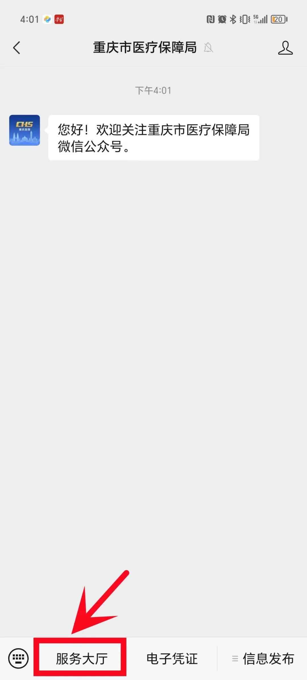 關注“重慶市醫療保障局”微信公眾號,點擊“服務大廳”。