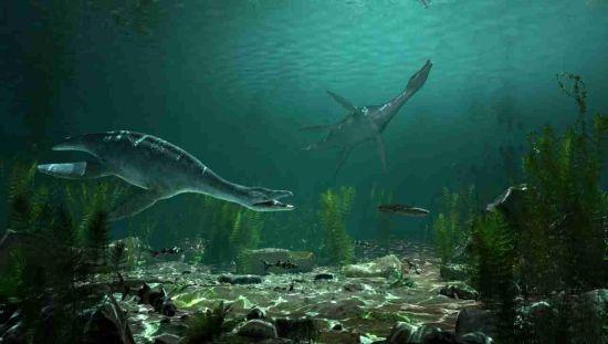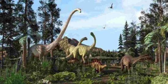 距今2.52~0.66億年中生代自然地貌環境與現代截然不同,天時地利特別適應恐龍生存。地殼劇烈運動在地殼大陸形成諸多山間盆地,河流湖泊星羅棋布,得天獨厚溫床般空間環境為恐龍家族繁衍生息奠定堅實基礎。全球氣候環境溫暖潮濕,極地和赤道溫差較小,水杉、蘇鐵、松柏、銀杏、懸鈴木等喜溫森林植物茂盛,古樹參天,叢林密布,為食素恐龍提供源源不斷的“糧食資源”。專家推測恐龍食物量相當大,一頭30噸重蜥腳類素食恐龍,日進食2噸。中生代煤炭資源廣泛分布,印證彼時高大喬木生長環境。上個世紀80年代加拿大地質學家在北極圈埃爾斯米爾島發現一片以水杉為主樹林以及鱷等化石,說明極地具熱帶氣候環境。