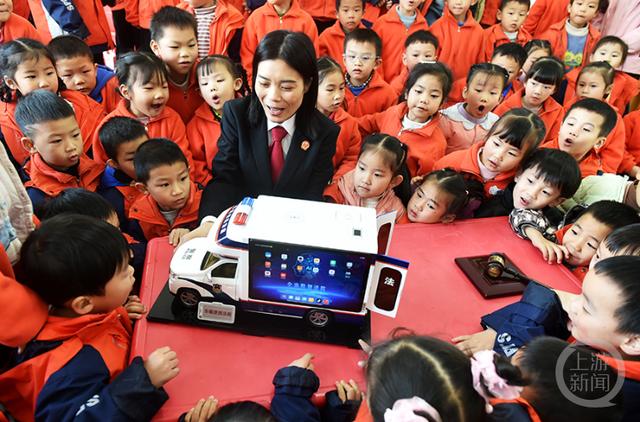 “車載便民法庭”功能啟動觀摩環節,幼兒園的娃娃們對“車載便民法庭”非常感興趣。