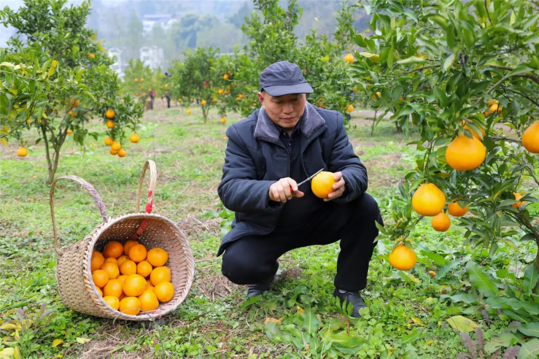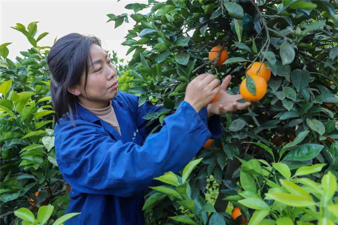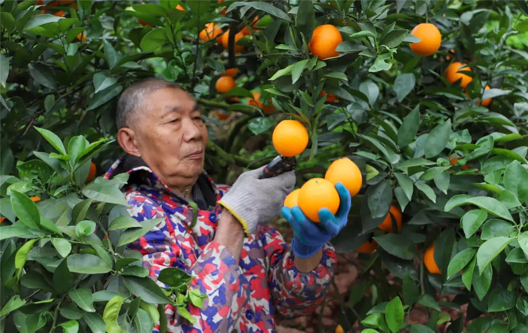 在柑橘種植戶趙小平的果園,熹微的陽光將樹影拉得修長,滿樹圓潤飽滿的“小金果”為滿目碧色增添了耀眼的點綴。趙小平手持剪刀,輕輕一剪,再將一顆顆“小金果”輕輕放入簍中,整個過程都充滿了對果實的愛護。