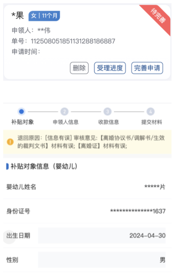 ②點擊首頁的【完善申請】按鈕,或“進度”頁面中的【完善申請】按鈕,可以繼續修改信息,最上方會顯示退回原因,方便申領人修改對應信息。
