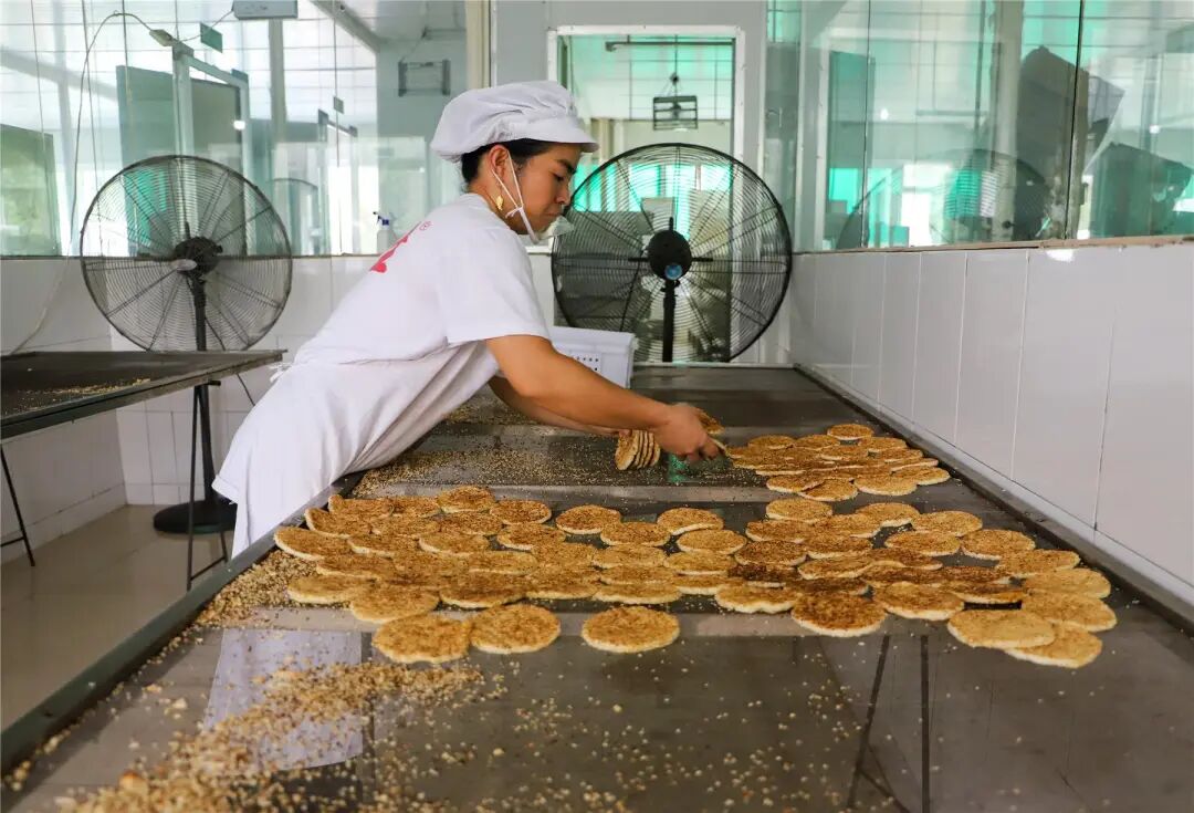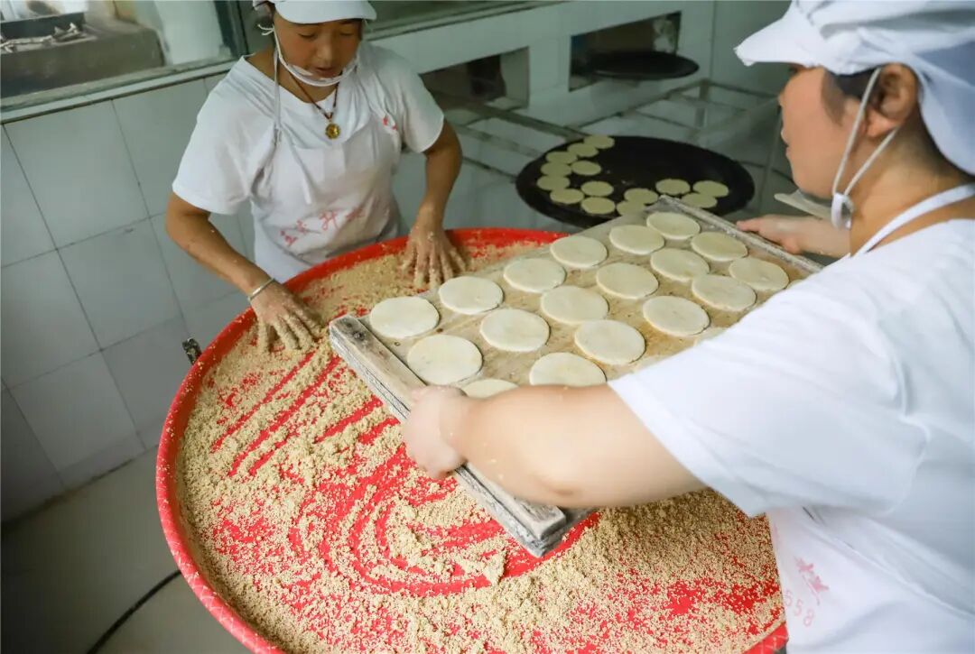 半分鐘內循環烘烤月餅兩次,通過聽聲、聞香、觀色,使月餅呈現兩面金黃狀態,上面的芝麻顆顆酥脆,令人垂涎欲滴。徒弟們坦言,全廠只有老師傅敢用明火,多一秒則焦糊,少一秒則夾生。