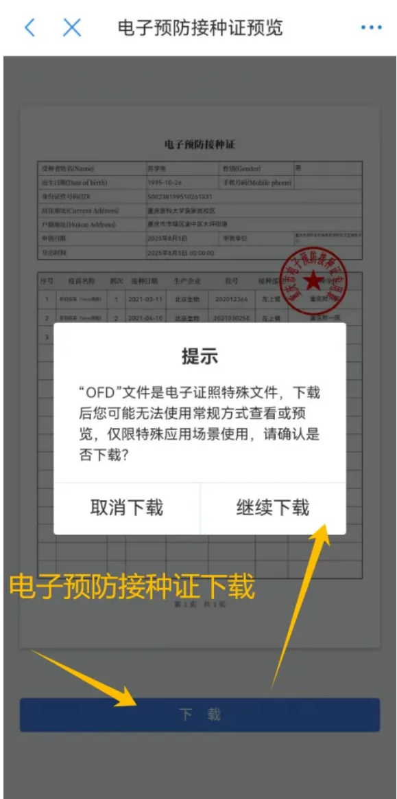 2.點(diǎn)擊底部的下載,會(huì)彈出“OFD文件”提示,無需擔(dān)心,點(diǎn)擊“繼續(xù)下載”即可。下載的OFD文件可通過WPS進(jìn)行查看。