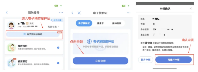 進(jìn)入“電子預(yù)防接種證”,點(diǎn)擊“立即申領(lǐng)”,選擇“同意并申領(lǐng)”確認(rèn)。