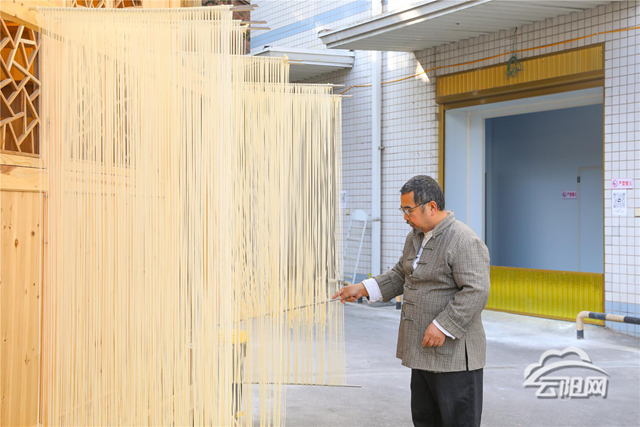 “巴陽山上的杠子面,壓呀壓成坨,世代永相傳吶,慢慢兒聽我說......”在“巴陽杠子面大師工作室”里,正傳出陣陣歌聲。巴陽杠子面非遺工坊第三十七代傳承人劉益在歡快的歌聲中,用竹杠反復壓制面團,他還詳細介紹著現在杠子面的每一個制作流程。