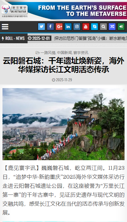 【鹿見寰宇訊】巍巍磐石城,屹立兩江間。11月23日,“追夢中華·新韻重慶”2025海外華文媒體采訪行走進云陽磐石城遺址公園,在這座被譽為“萬里長江第一寨”的千年古寨中,見證歷史遺存與現代文明的交融共鳴,感受長江文化在當代的活態傳承與創新發展。