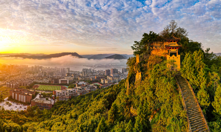 全長1400余米的登云梯如巨龍躍江,沿著1999級石階拾級而上,登頂磐石城遺址,360度無遮擋江景與群山遠景盡收眼底。雙井寨的古寨門、養龍先生的傳說、高祖閣的漢韻、橘官堂的橘香、“天下第一聯”的墨寶、詩文長廊的雅韻,步步皆景,步步皆史。
