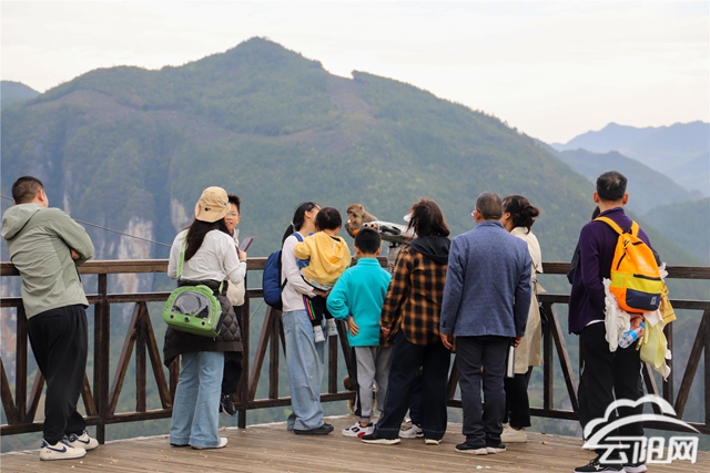在云陽世界地質公園龍缸景區,被譽為“天下第一缸”的天坑奇觀與世界最長懸挑玻璃廊橋——云端廊橋成為游客熱門打卡點。來自湖北的游客胡軍表示:“春假和清明假期正好有時間,帶著孩子來看看祖國的大好河山。廊橋很震撼,山勢險峻,游玩項目也很刺激。”