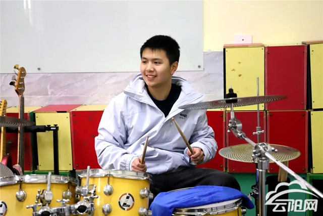 鼓手張軒睿,這個(gè)身高一米八的陽(yáng)光少年,舞臺(tái)上節(jié)奏鏗鏘有力,私下里卻是個(gè)“黏人小調(diào)皮”。他格外依賴指導(dǎo)老師羅圣冰,排練時(shí)要拉著老師的手才安心,休息時(shí)總跟在老師身后,像個(gè)小尾巴。他愛(ài)熱鬧,喜歡小伙伴圍在身邊,偶爾會(huì)故意敲錯(cuò)鼓點(diǎn),引起大家的注意,看到別人笑,他也會(huì)跟著咧嘴大笑,眼神里滿是純粹的快樂(lè)。以前的他情緒極易失控,如今在音樂(lè)與陪伴下,變得開朗又溫和,只是偶爾還會(huì)耍點(diǎn)小脾氣,不肯練習(xí)時(shí),要老師哄著、陪著,才愿意拿起鼓槌,模樣既倔強(qiáng)又可愛(ài)。