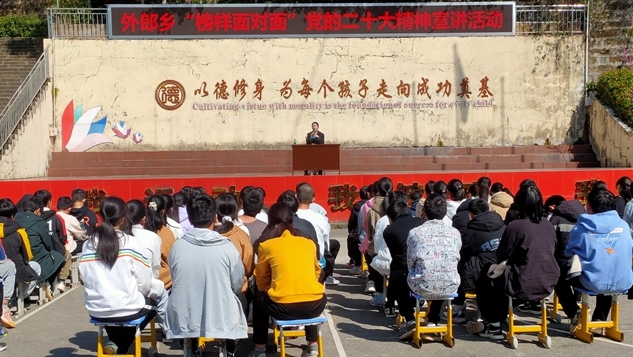 3月15日,“榜樣面對面”黨的二十大精神宣講隊云陽分隊成員走進外郎初中,在大操場上為師生宣講黨的二十大精神。