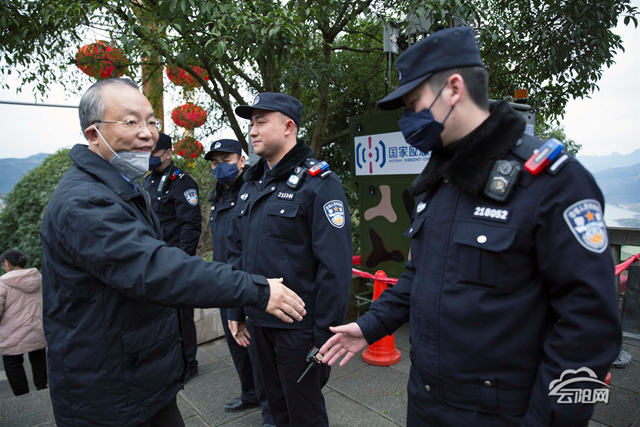 云陽網訊 (記者 劉興敏 唐斌)“新年好!給大家拜年了!”1月25日,正值大年初一,早上8點多,縣委書記張學鋒就來到登云梯,看望慰問執勤民警、文旅委以及市政執法人員等,給他們送去節日祝福,并與執勤人員一道,宣傳“新型冠狀病毒感染”有關疫情知識,勸導市民少出門,不集聚,以免感染病毒。